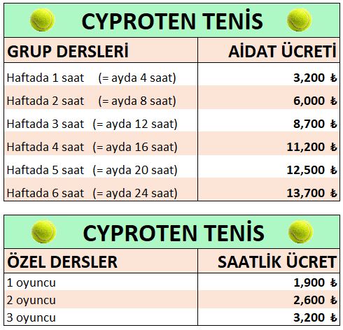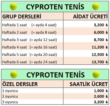 Kurs ücretlerinin Güncellenmesi: KKTC Tenis Federasyonu, kort kiralarında ve diğer giderlerde (elektrik katkısı, vs.) değişiklik yapması durumunda, CYPROTEN tenis, kurs ücretlerini güncelleme hakkına sahiptir. Böyle bir güncelleme durumunda, öğrenci ya da velisine ücret değişikliğinden en az 2 hafta önceden bilgilendirme yapılır.